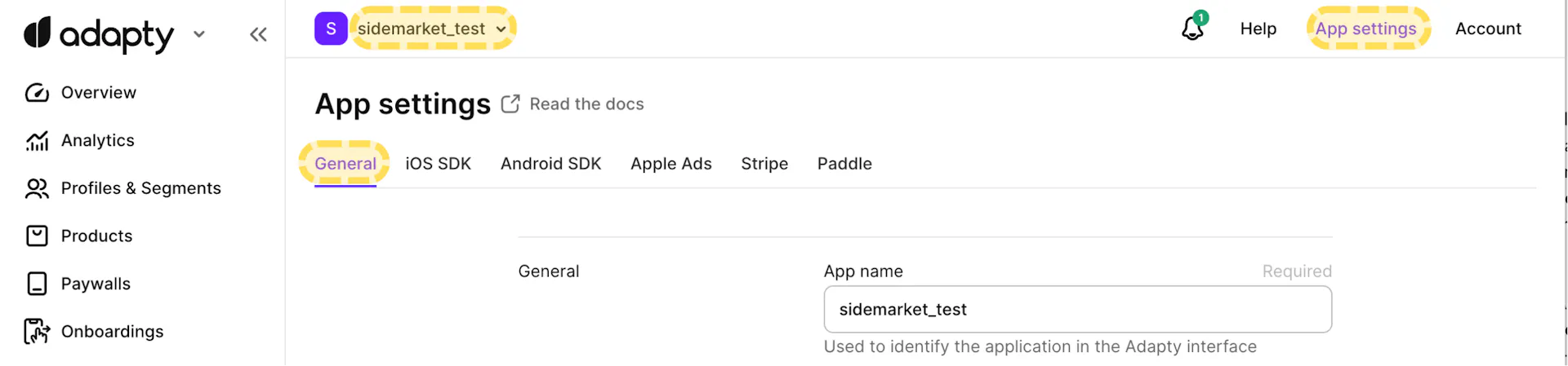 - Go to your Adapty dashboard and select your app. Click App settings in the top navigation bar, then open the General tab.