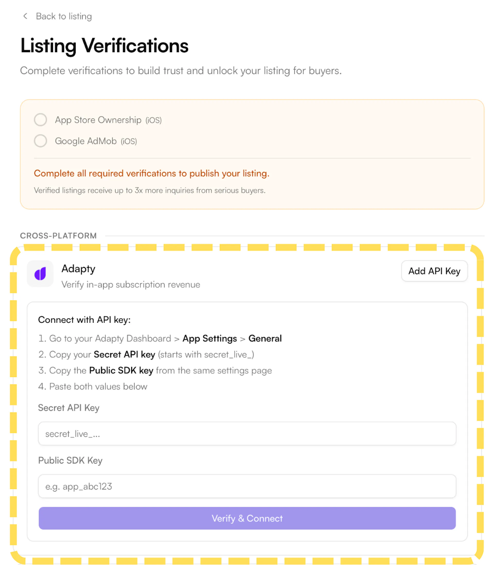 - On the Listing Verifications page, find Adapty under the Cross-Platform section and click Add API Key. A panel will expand with the steps and input fields.