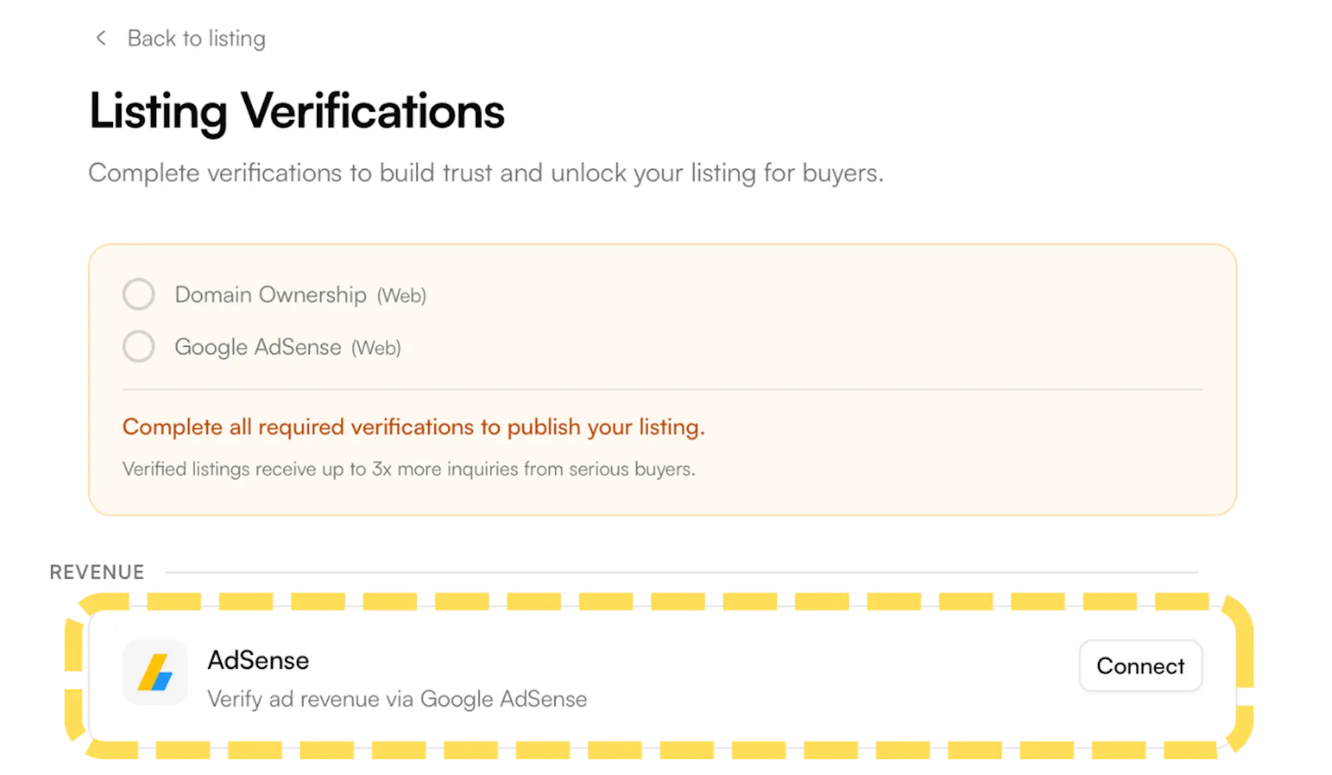 - On the Listing Verifications page, find AdSense under the Revenue section and click Connect.