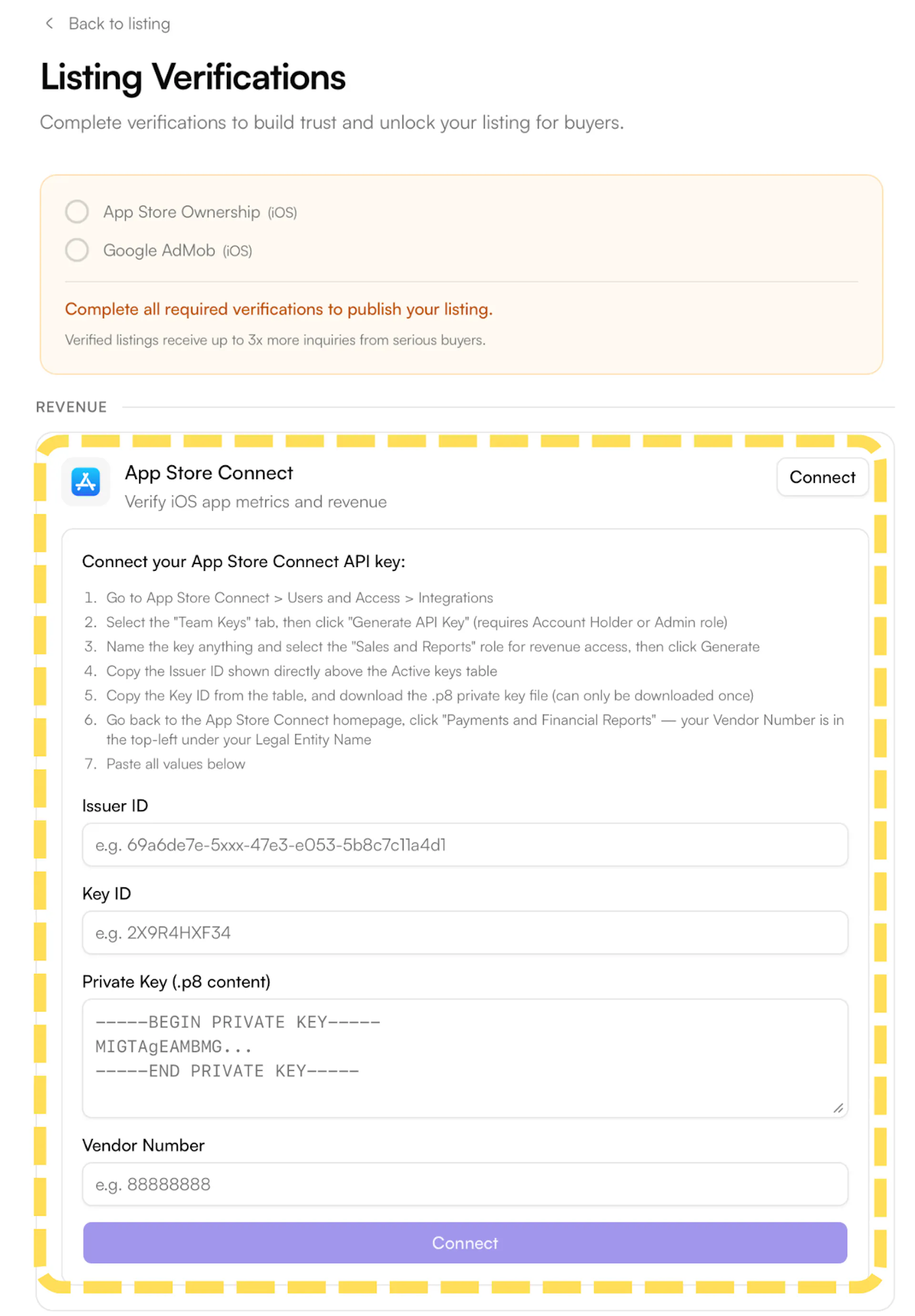 - On the Listing Verifications page, find App Store Connect under the Revenue section and click Connect. A panel will expand with the steps and input fields.