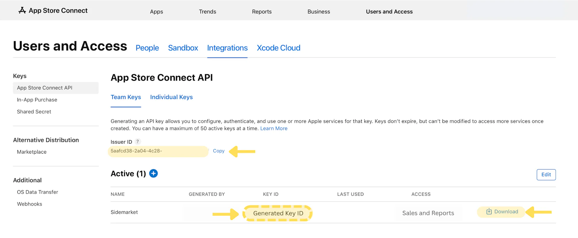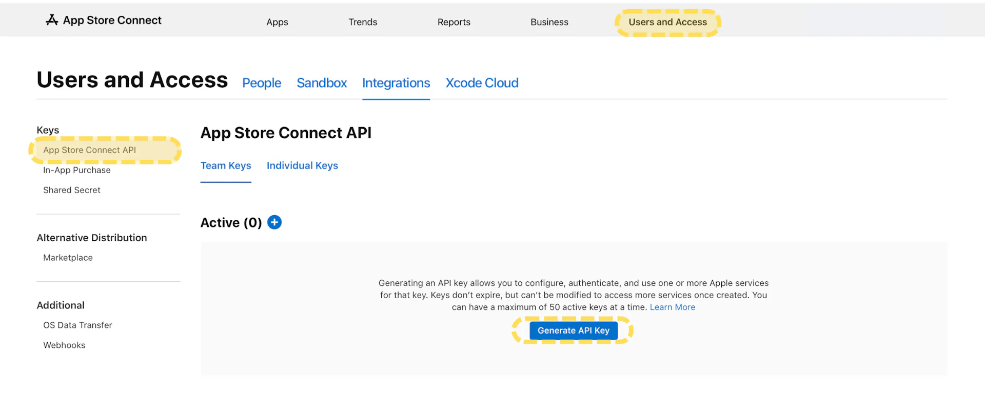 - Go to App Store Connect and click Users and Access in the top navigation. Open the Integrations tab, then select App Store Connect API under Keys.