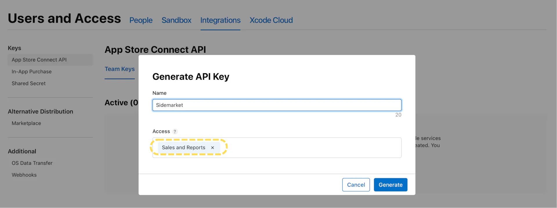 - Select the Team Keys tab and click Generate API Key. Give the key a name (e.g. Sidemarket) and set the Access to Sales and Reports. Click Generate.
