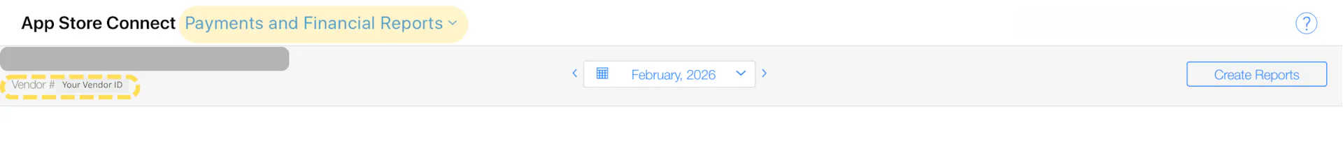 Go back to the App Store Connect homepage and click Payments and Financial Reports. Your Vendor Number is shown in the top-left corner below your Legal Entity Name.
