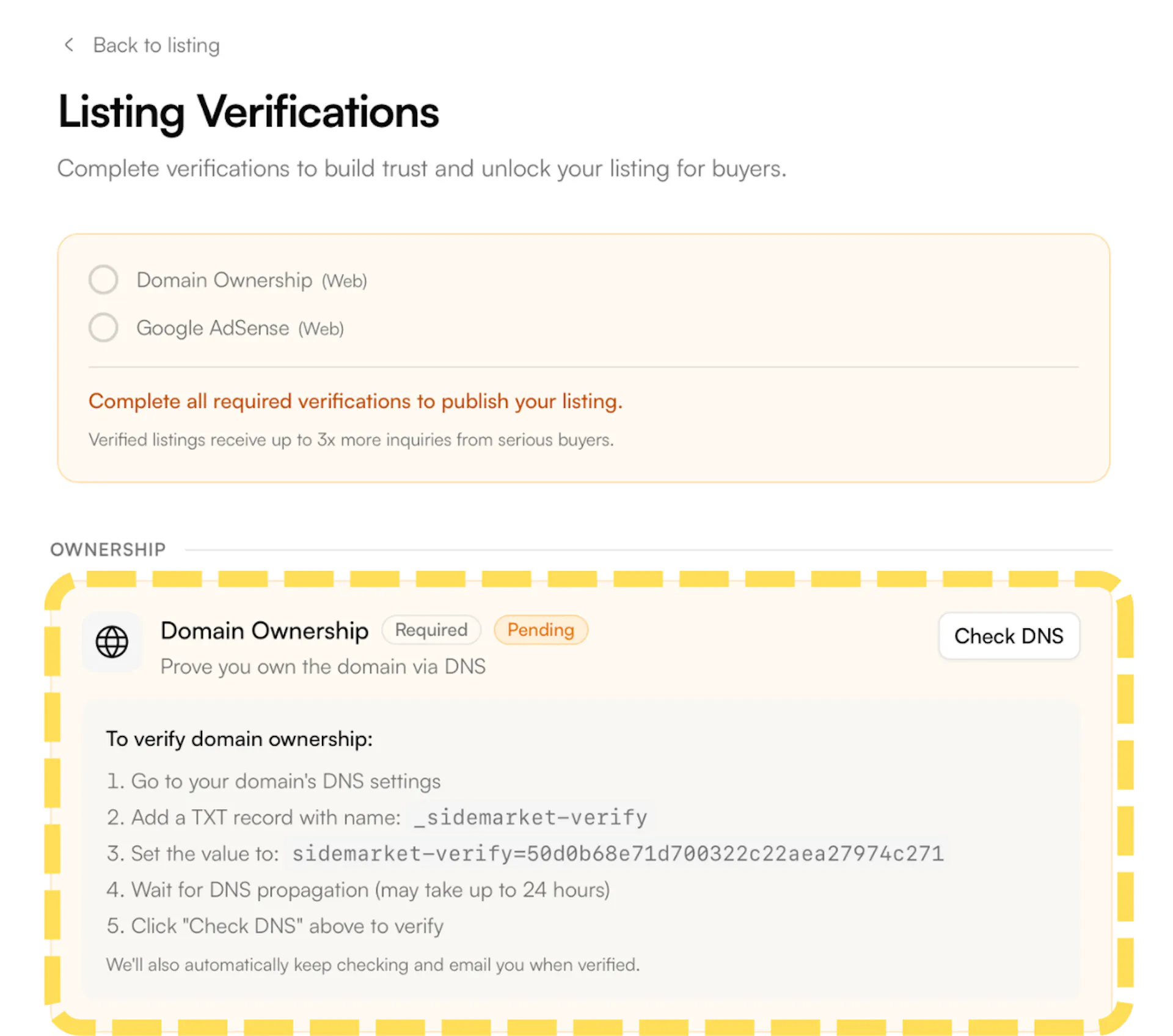 - On the Listing Verifications page, find Domain Ownership under the Ownership section and click Connect. A panel will expand showing your unique verification code and the steps below.