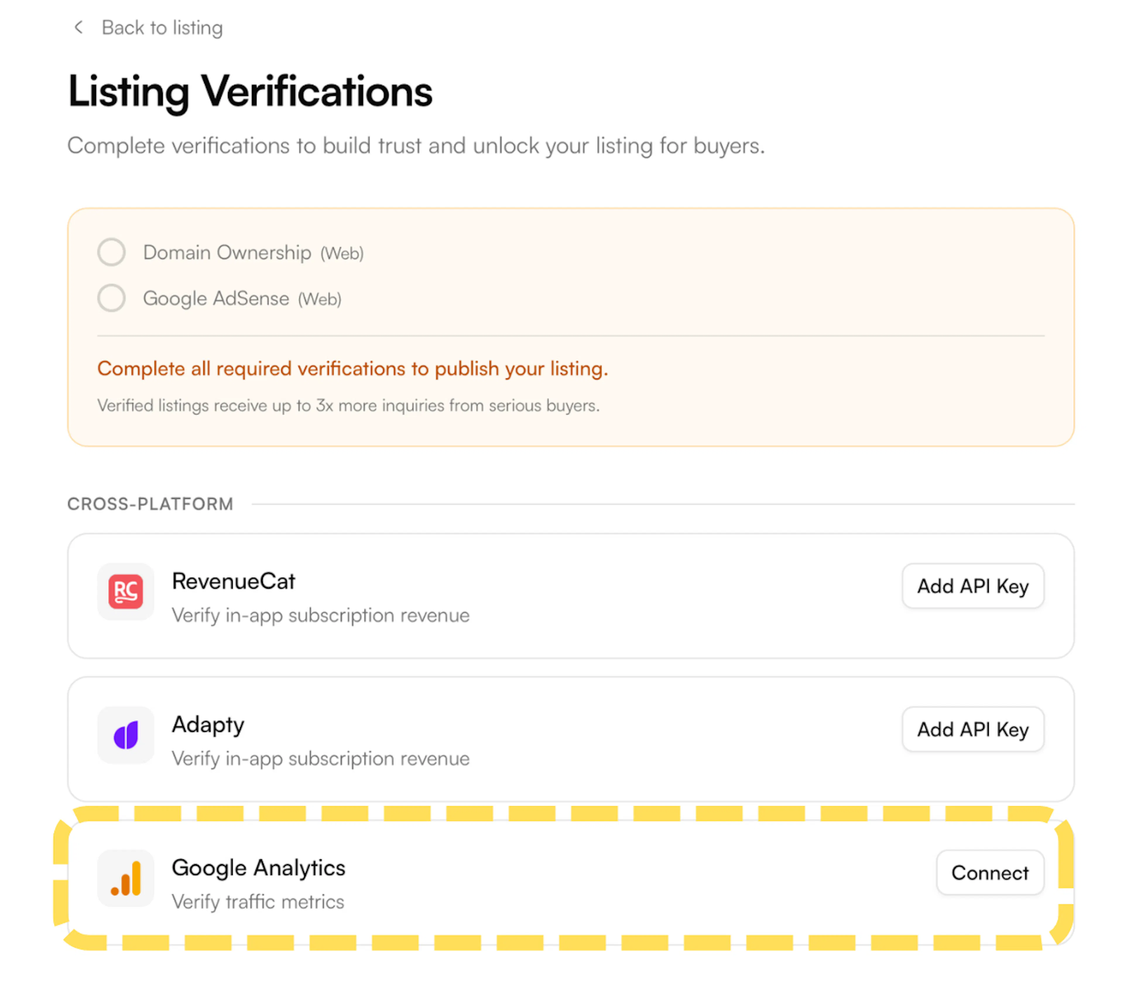 - On the Listing Verifications page, find Google Analytics under the Cross-Platform section and click Connect.