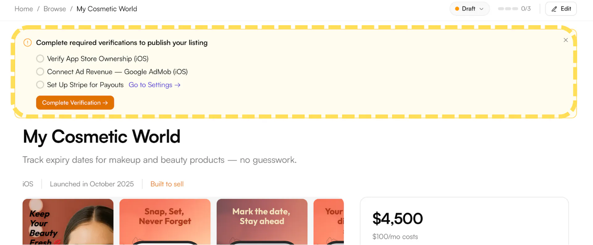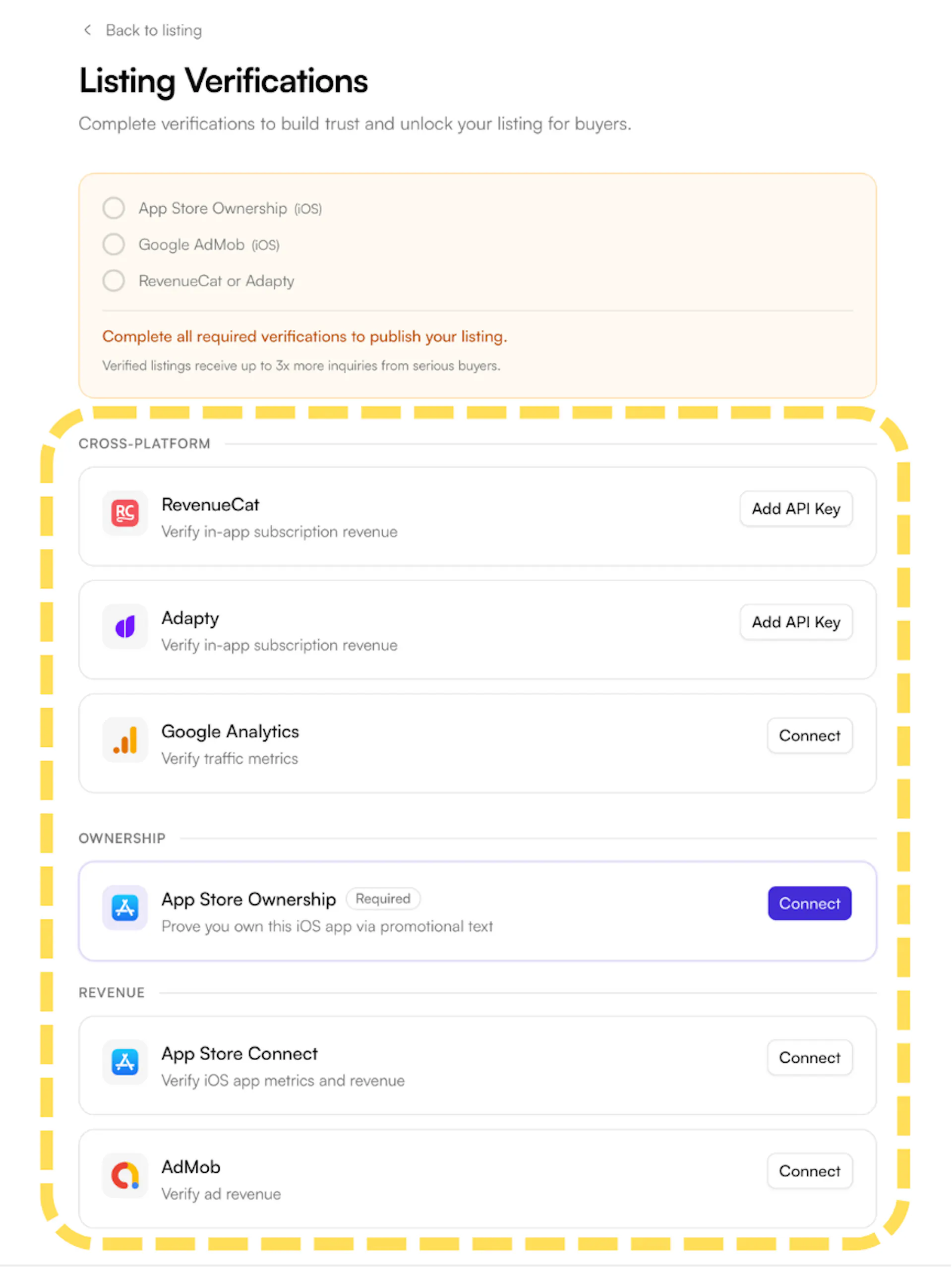 - The verifications required for your listing depend on the revenue model you selected during listing creation.
