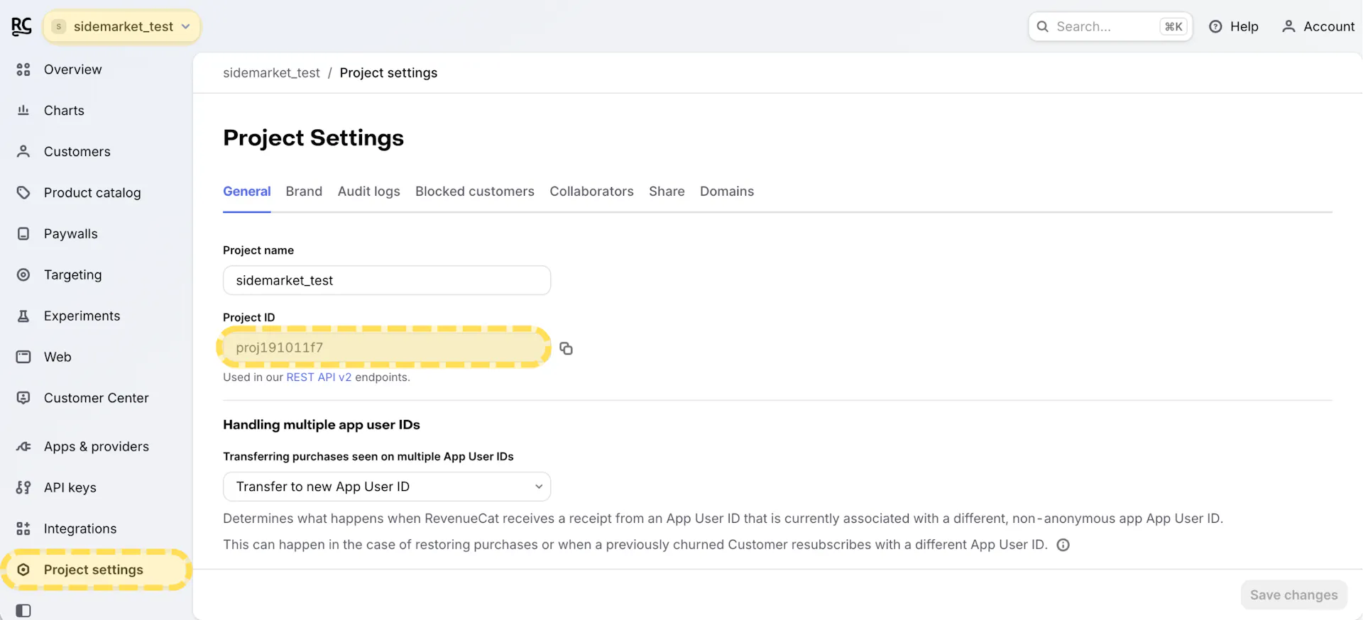 Click Project settings in the left menu and copy your Project ID. You'll need this when connecting to SideMarket.