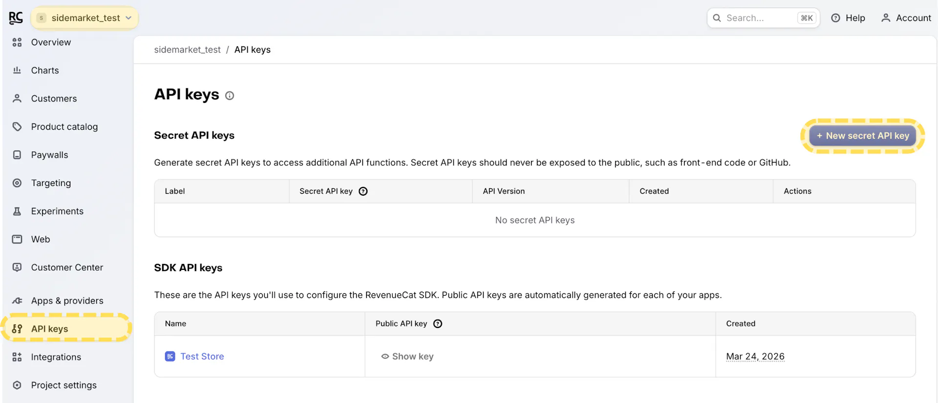- Click API Keys in the left menu. Under Secret API keys, click + New secret API key.