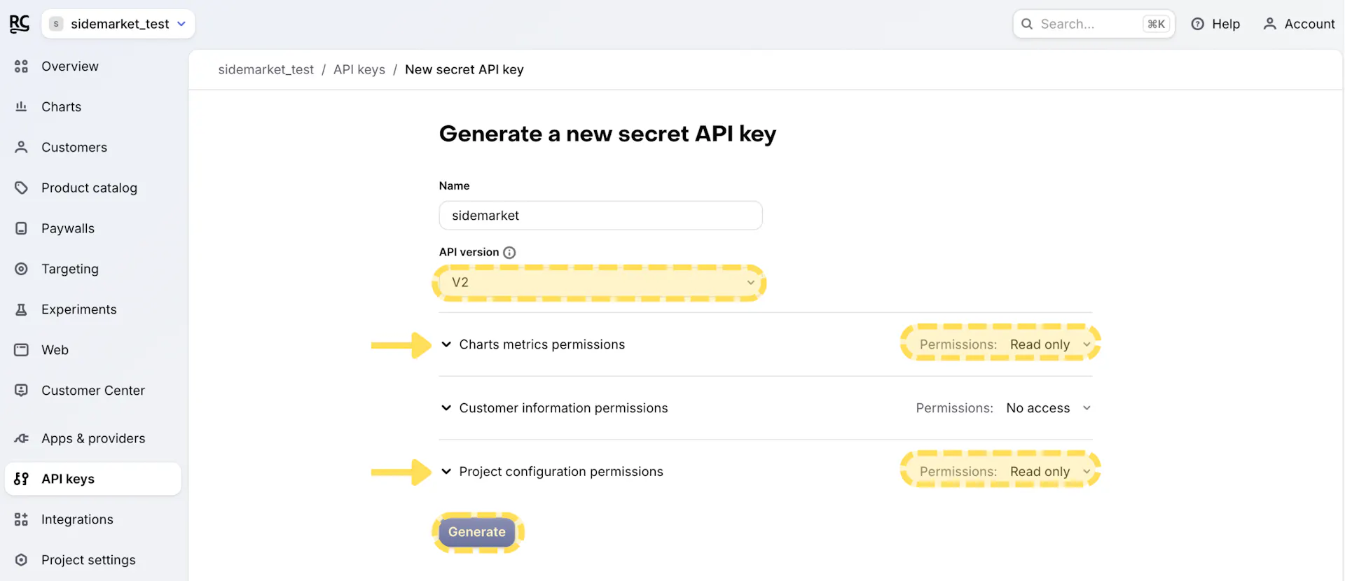 Generate and copy the key. You'll need this when connecting to SideMarket.