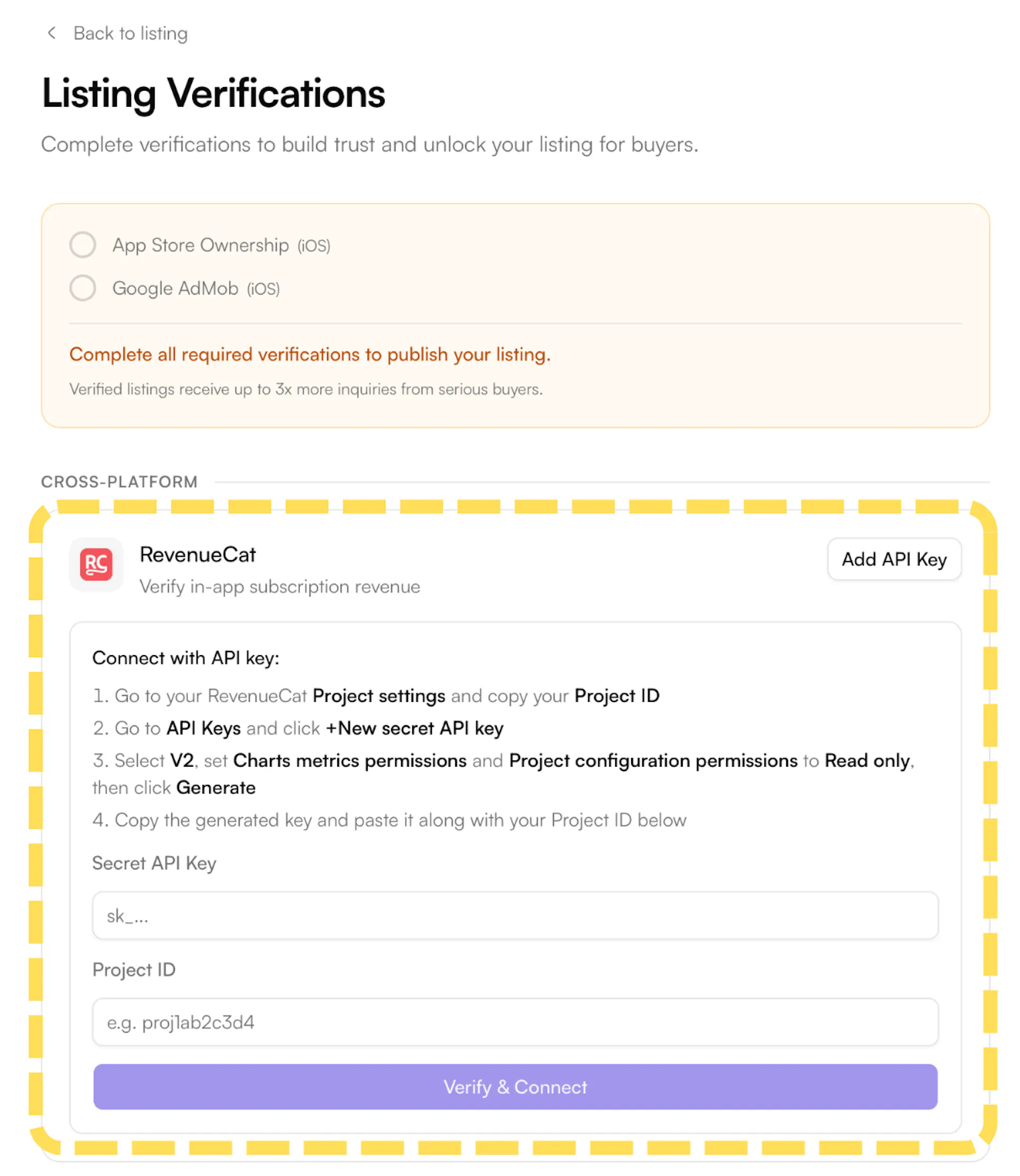 - On the Listing Verifications page, find RevenueCat under the Cross-Platform section and click Add API Key. A panel will expand with the steps and input fields.